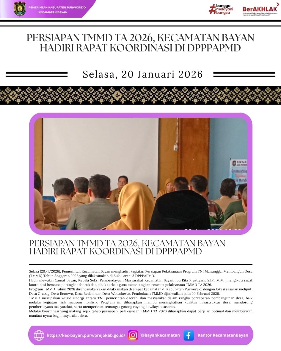 • Persiapan TMMD TA 2026, Kecamatan Bayan Hadiri Rapat Koordinasi di DPPPAPMD0