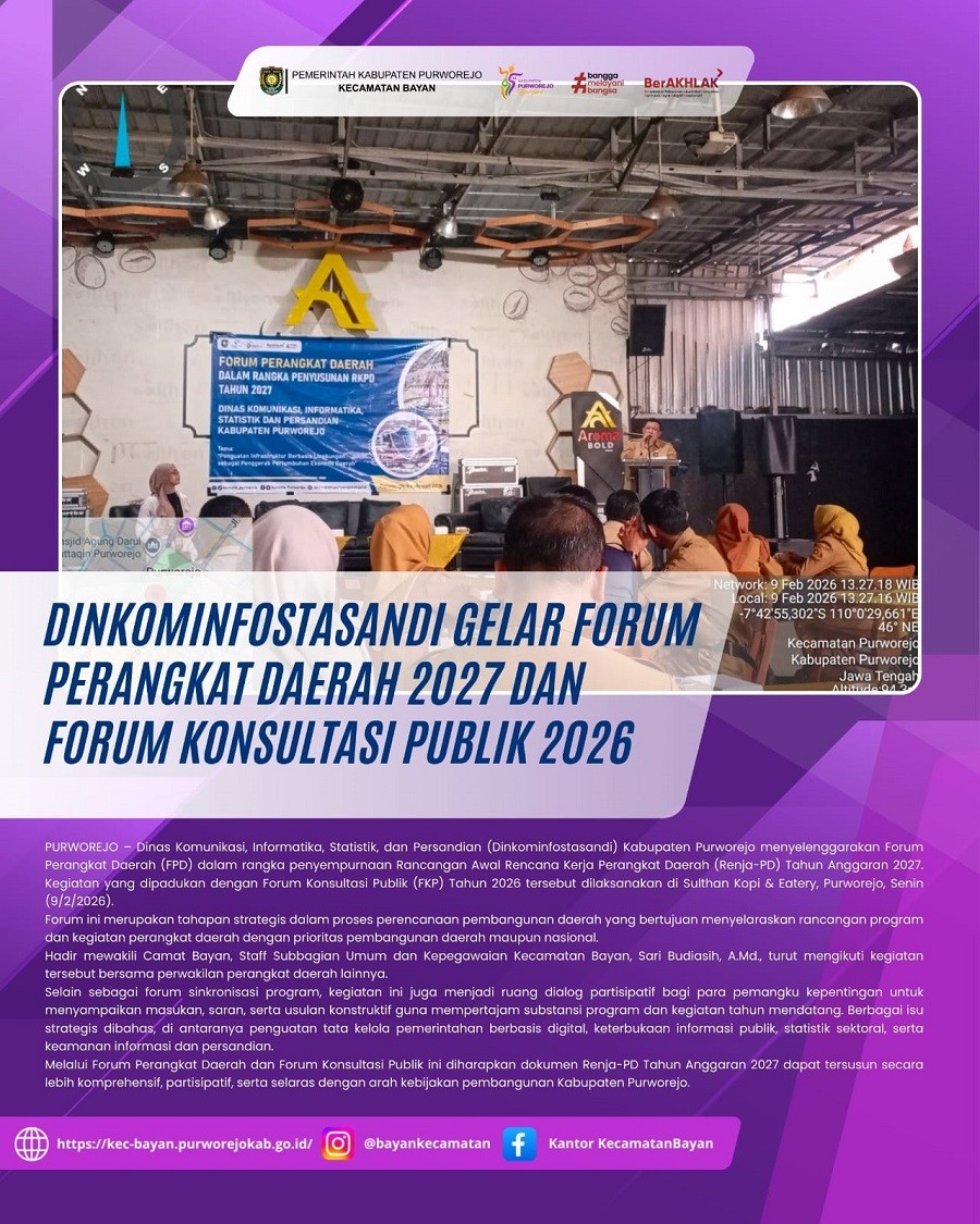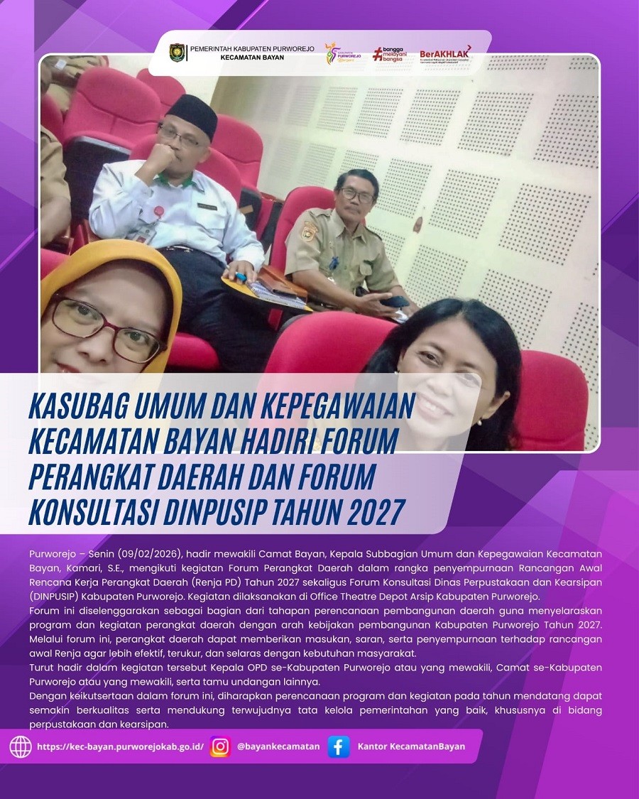 - Kasubag Umum dan Kepegawaian Kecamatan Bayan Hadiri Forum Perangkat Daerah dan Forum Konsultasi DINPUSIP Tahun 2027