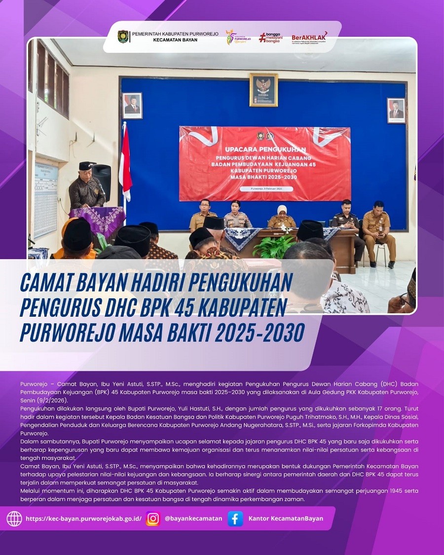 ▴ ▴ - Camat Bayan Hadiri Pengukuhan Pengurus DHC BPK 45 Kabupaten Purworejo Masa Bakti 2025–2030